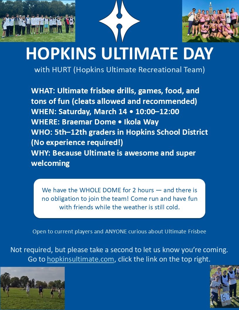 - $300 fee to Hopkins Ultimate covers practice facilities, game fields, team registration and coaches